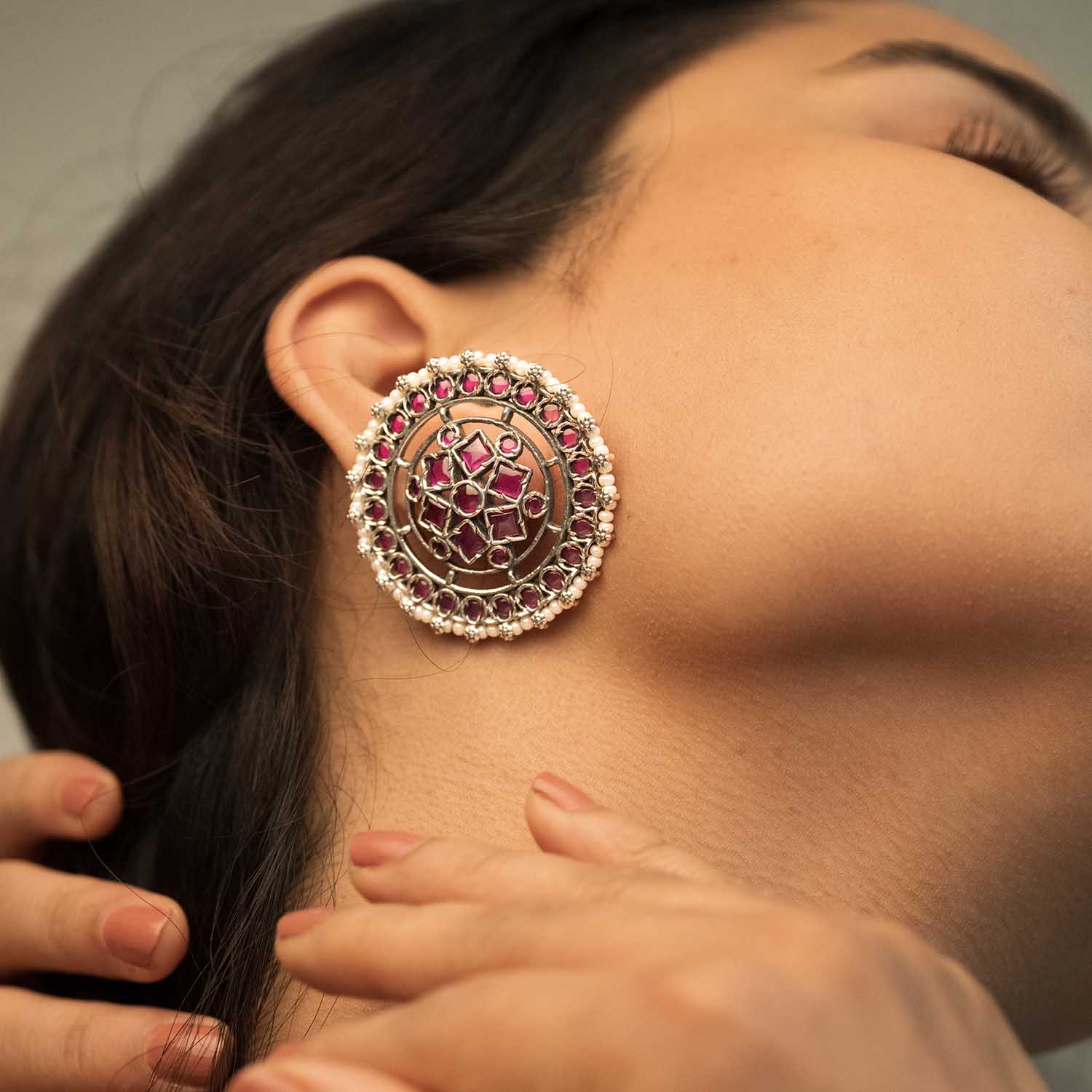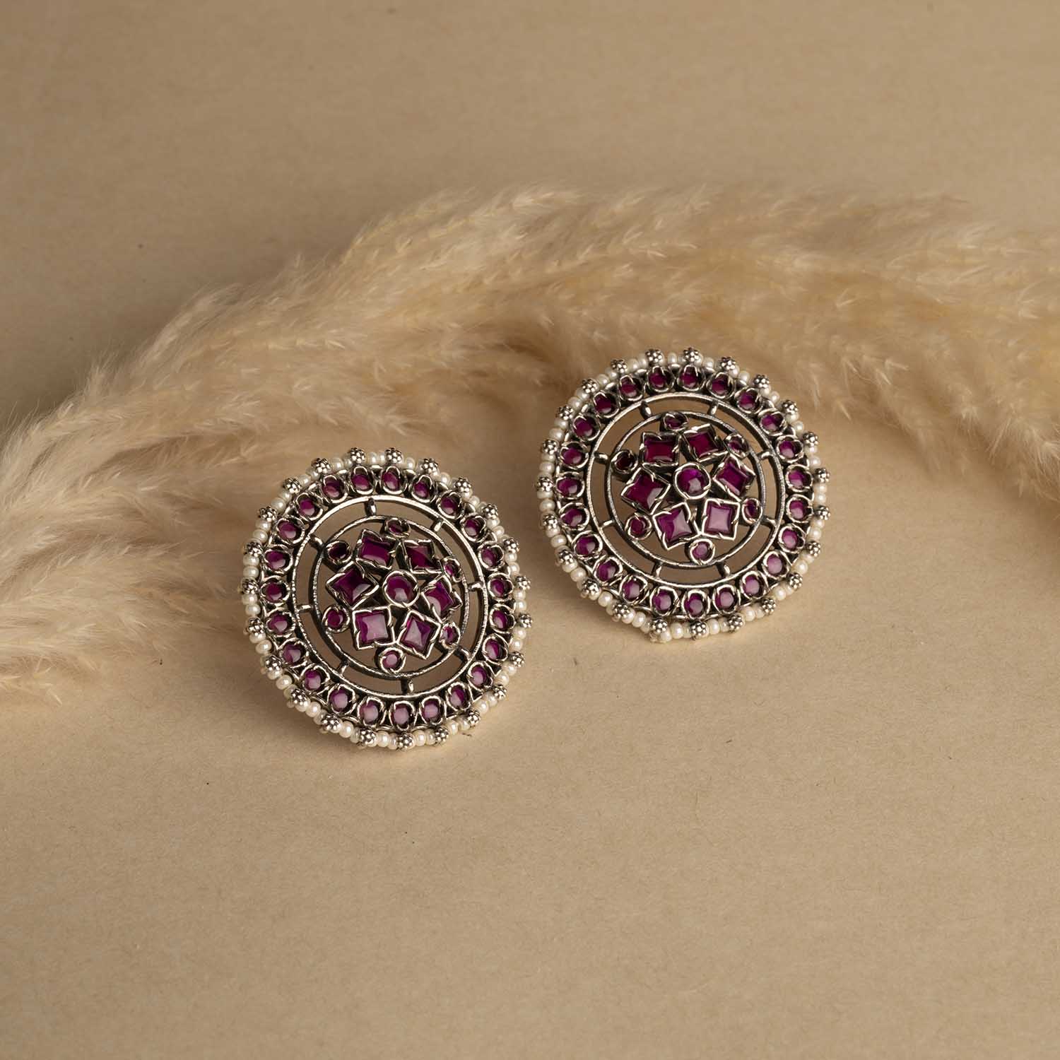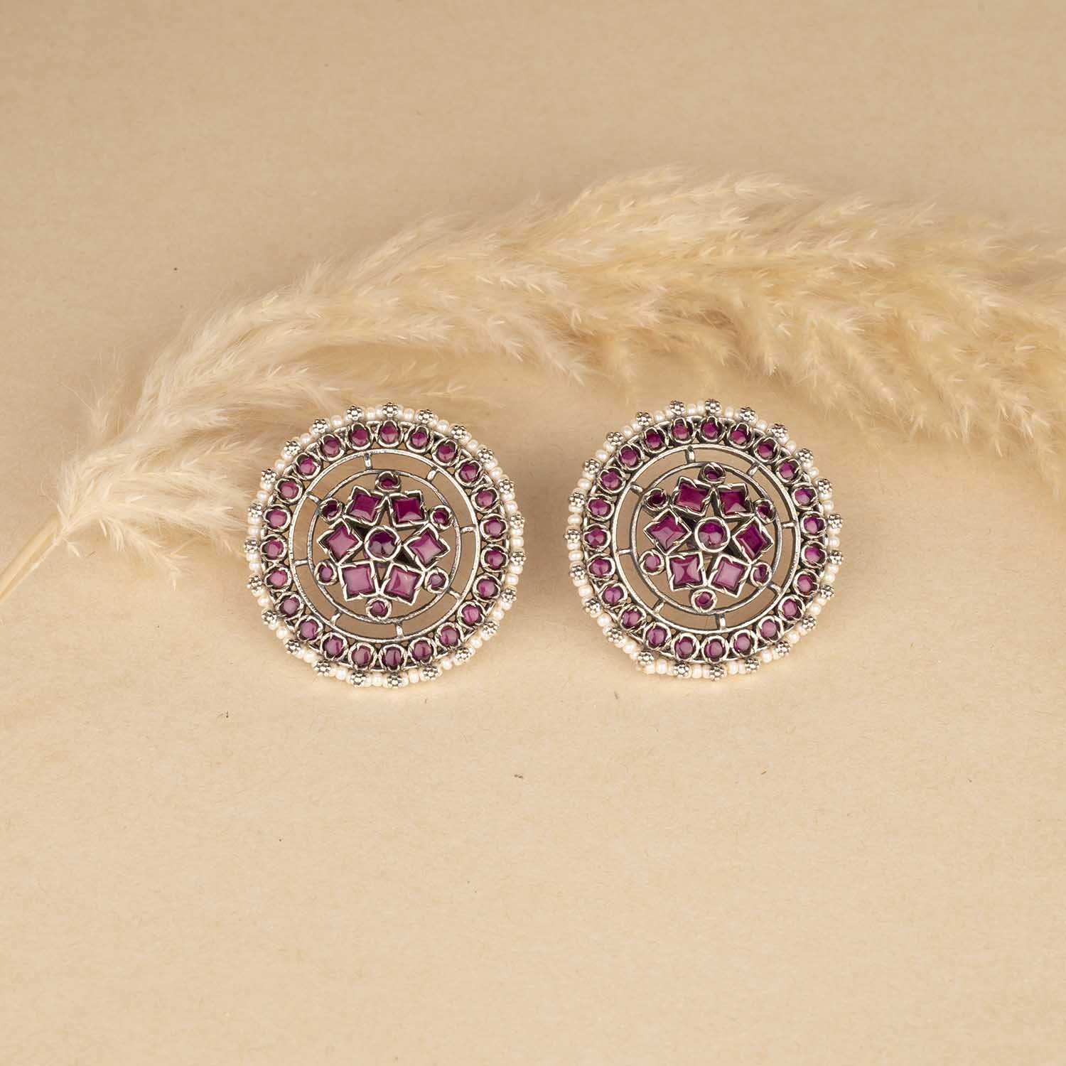 Bring regal charm to your look with these handcrafted silver earrings, adorned with deep ruby-hued stones in an intricate circular design. A timeless treasure for festive and traditional wear.