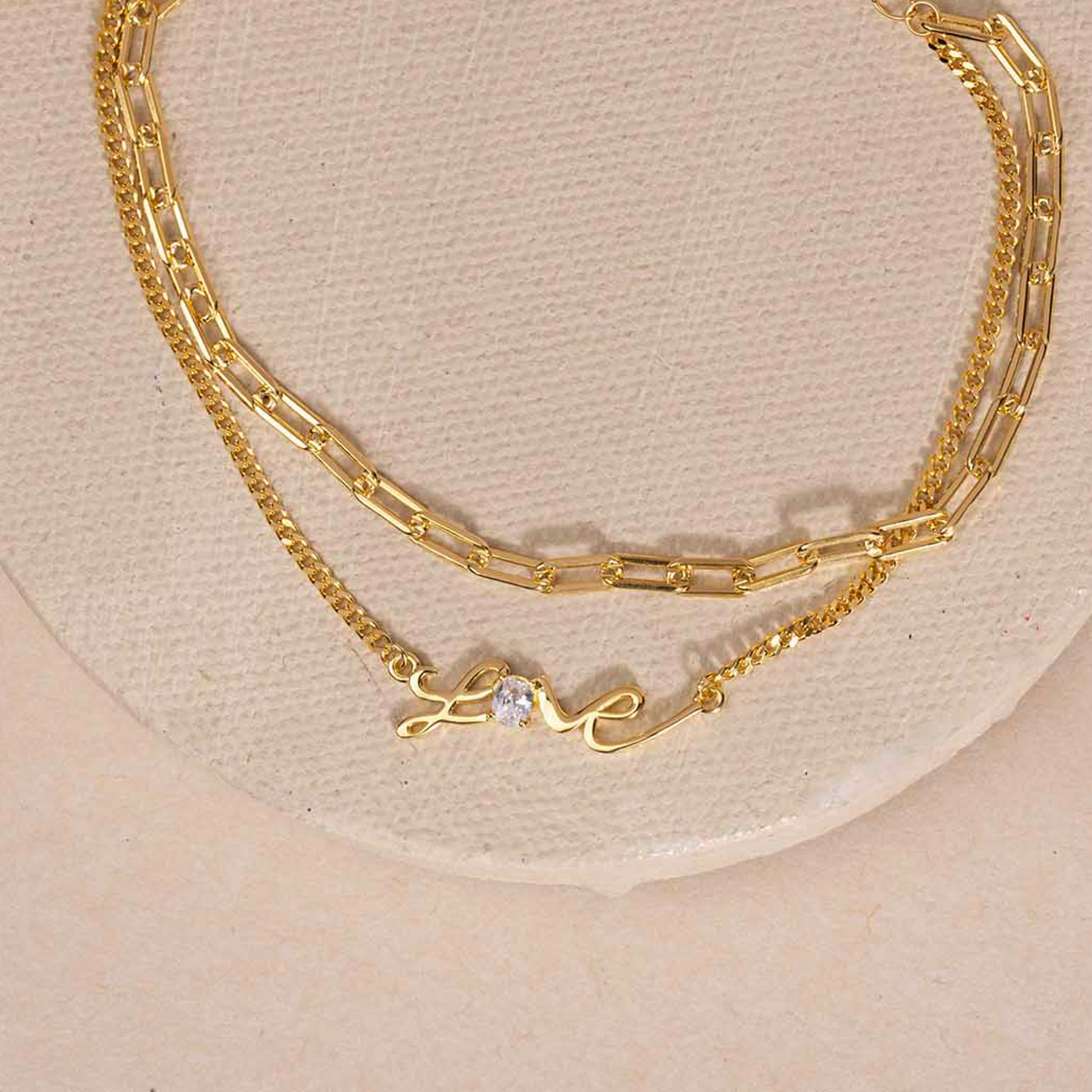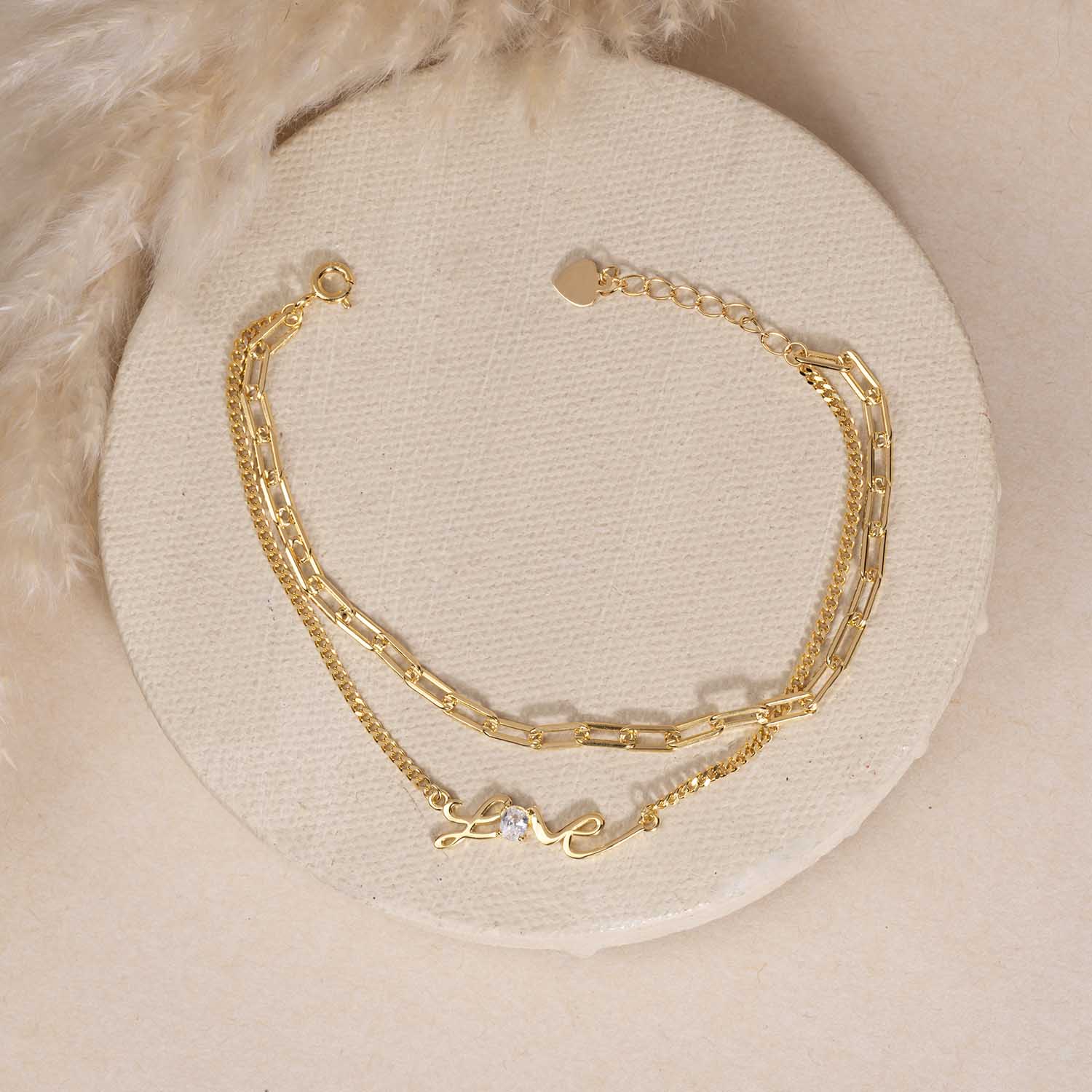 Gold-finish 925 silver bracelet featuring delicate letter charms spelling LOVE, a sweet symbol of affection and togetherness.