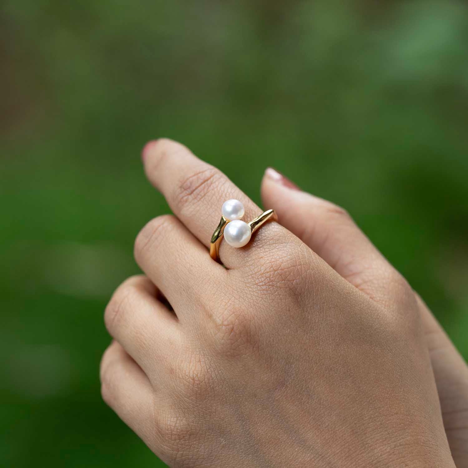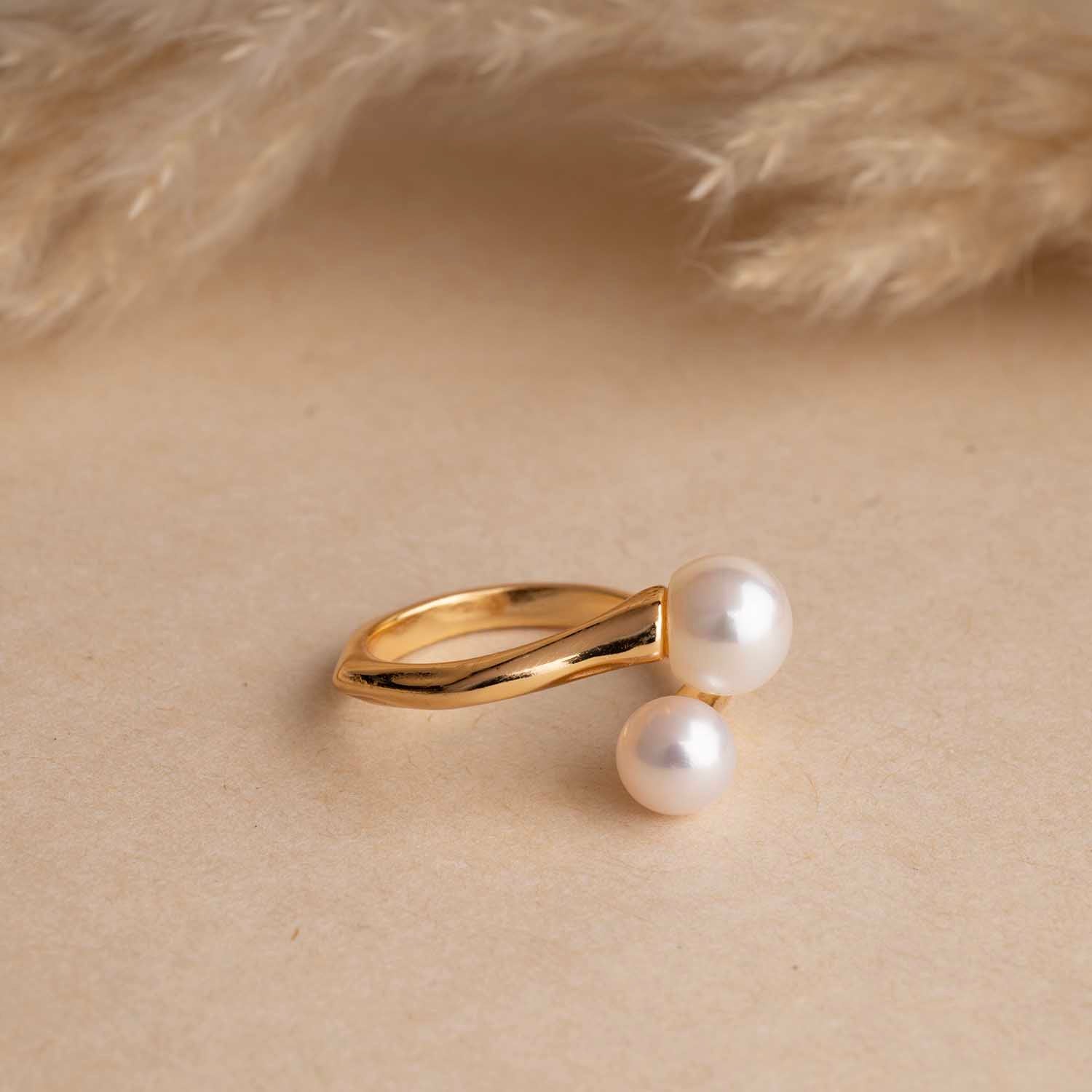 Crafted in sterling silver with a luxurious gold finish, this statement ring features twin pearls set in an artistic open band design. Its sleek curves and soft glow make it the ideal piece for women who love refined yet contemporary jewellery.