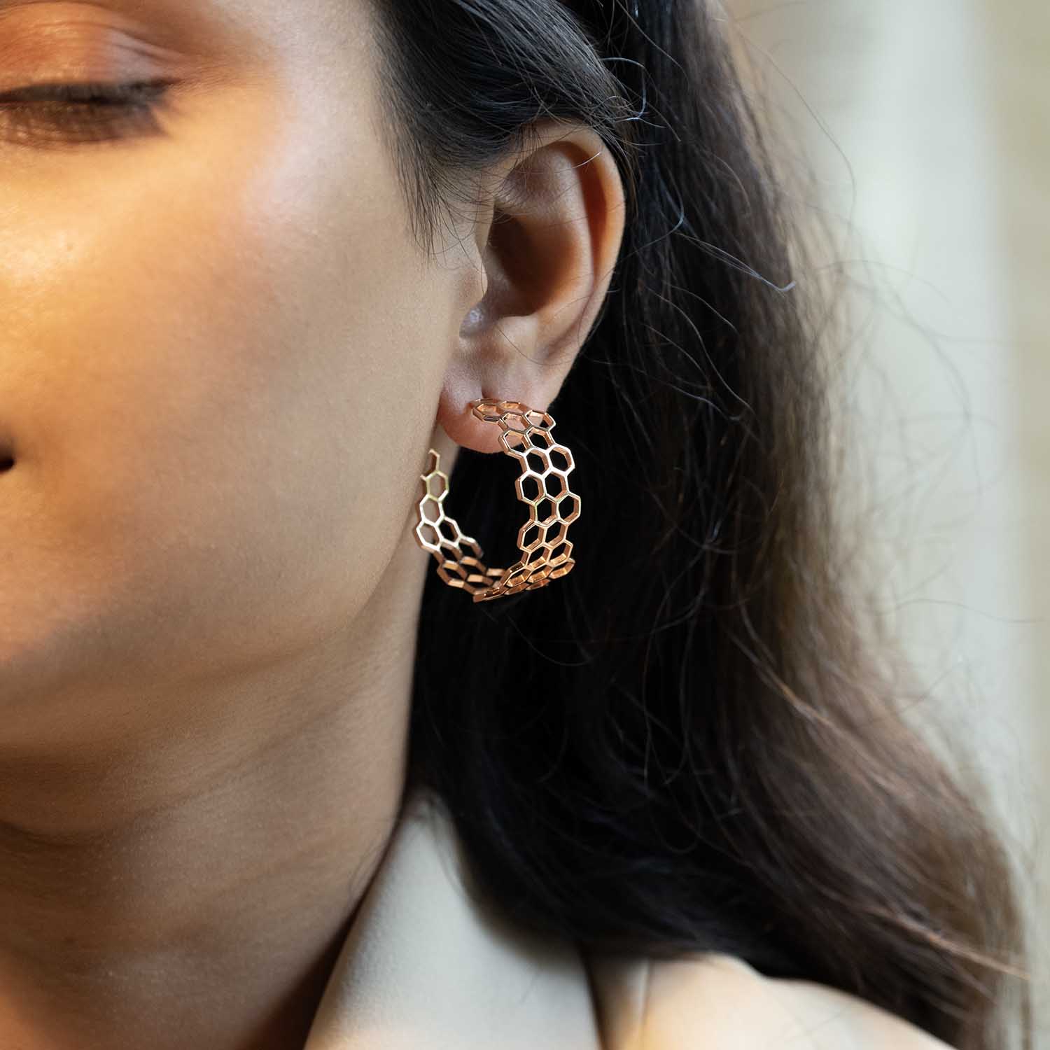 These hoops feature a delicate honeycomb pattern that blends modern geometry with timeless elegance. Lightweight yet striking, they’re perfect for adding a chic edge to both casual and formal looks.