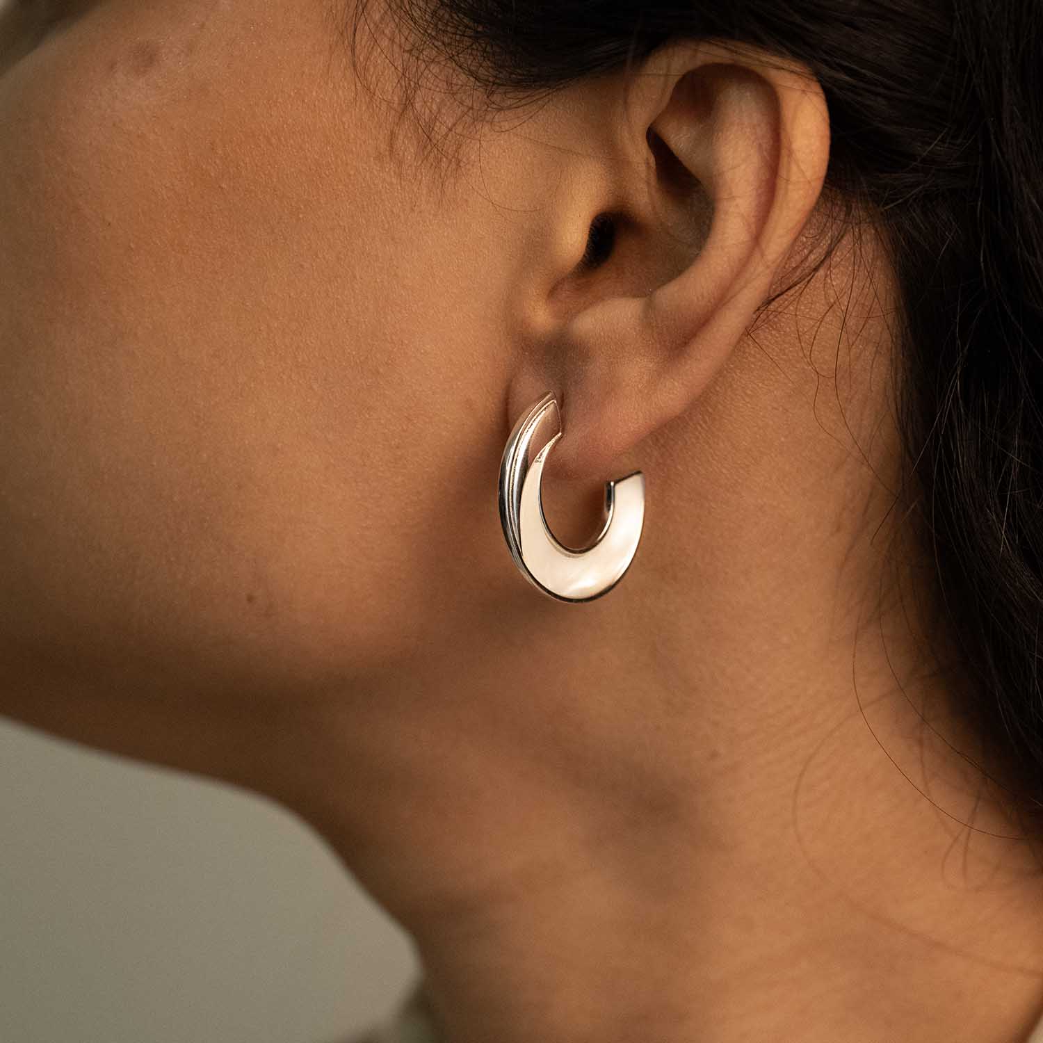 Crafted in 925 sterling silver, these hoops are adorned with delicate Mother of Pearl detailing that adds a soft, iridescent glow. Elegant and versatile, perfect for day-to-night wear.