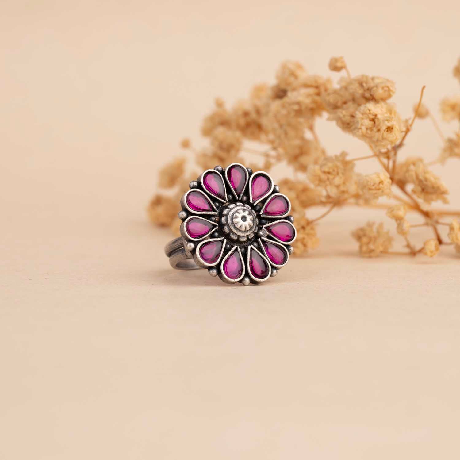 Bright and playful, this oxidized ring features vibrant pink petals with a detailed floral centerpiece. A pop of color for your jewelry box!