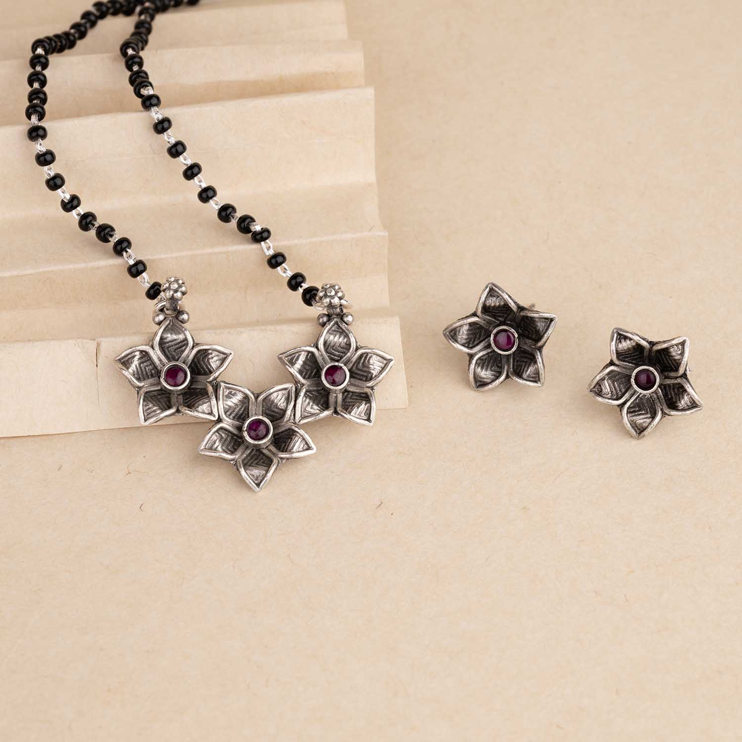 This mangalsutra features intricate floral carvings in silver, symbolizing eternal love and growth. The oxidized finish adds a touch of antique grace while remaining versatile for everyday use.