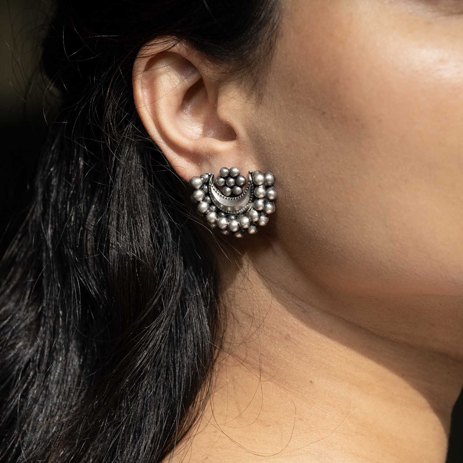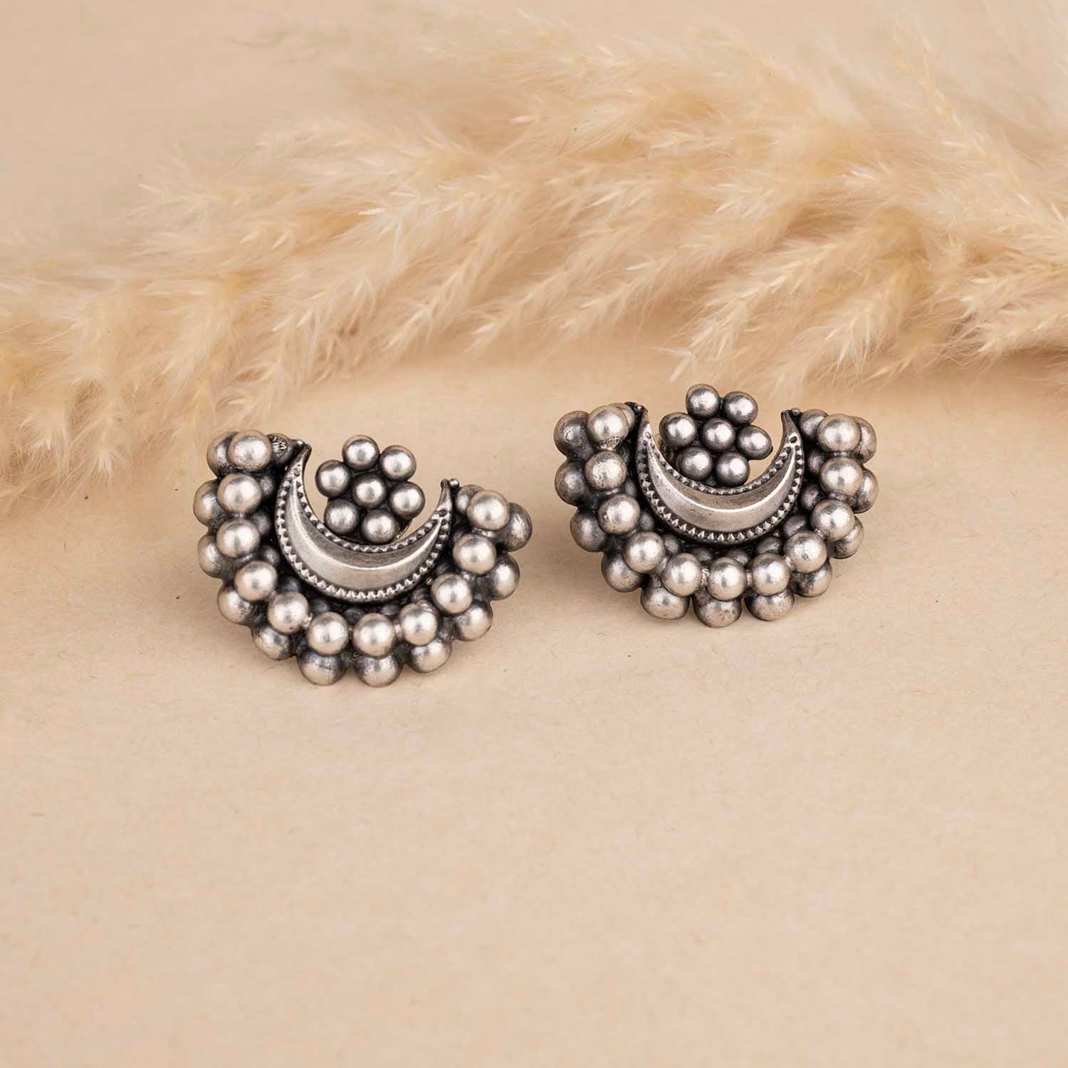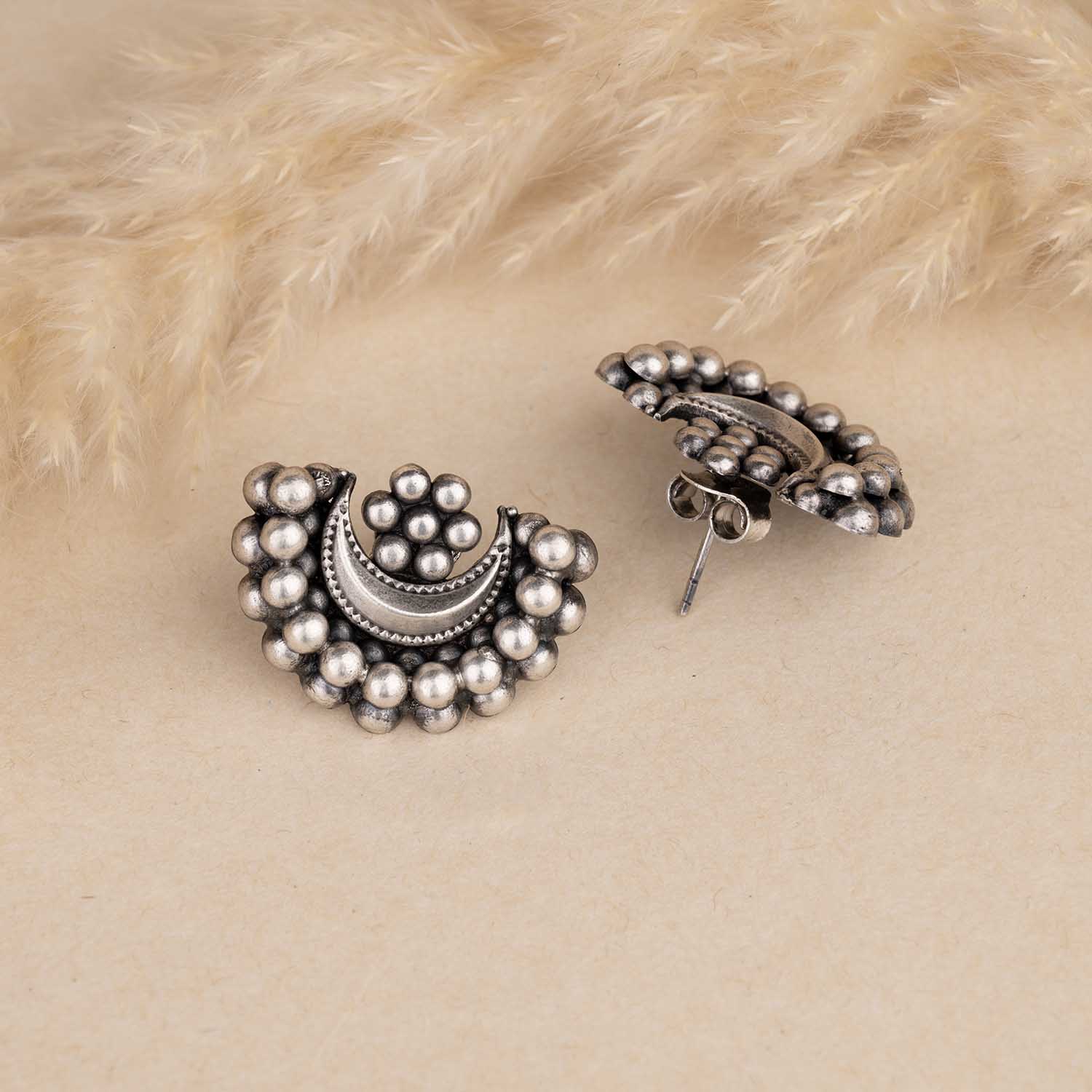 Crafted in oxidised silver, these earrings showcase a detailed crescent framed with vintage-style beads. A versatile accessory that reflects old-world artistry with modern wearability.