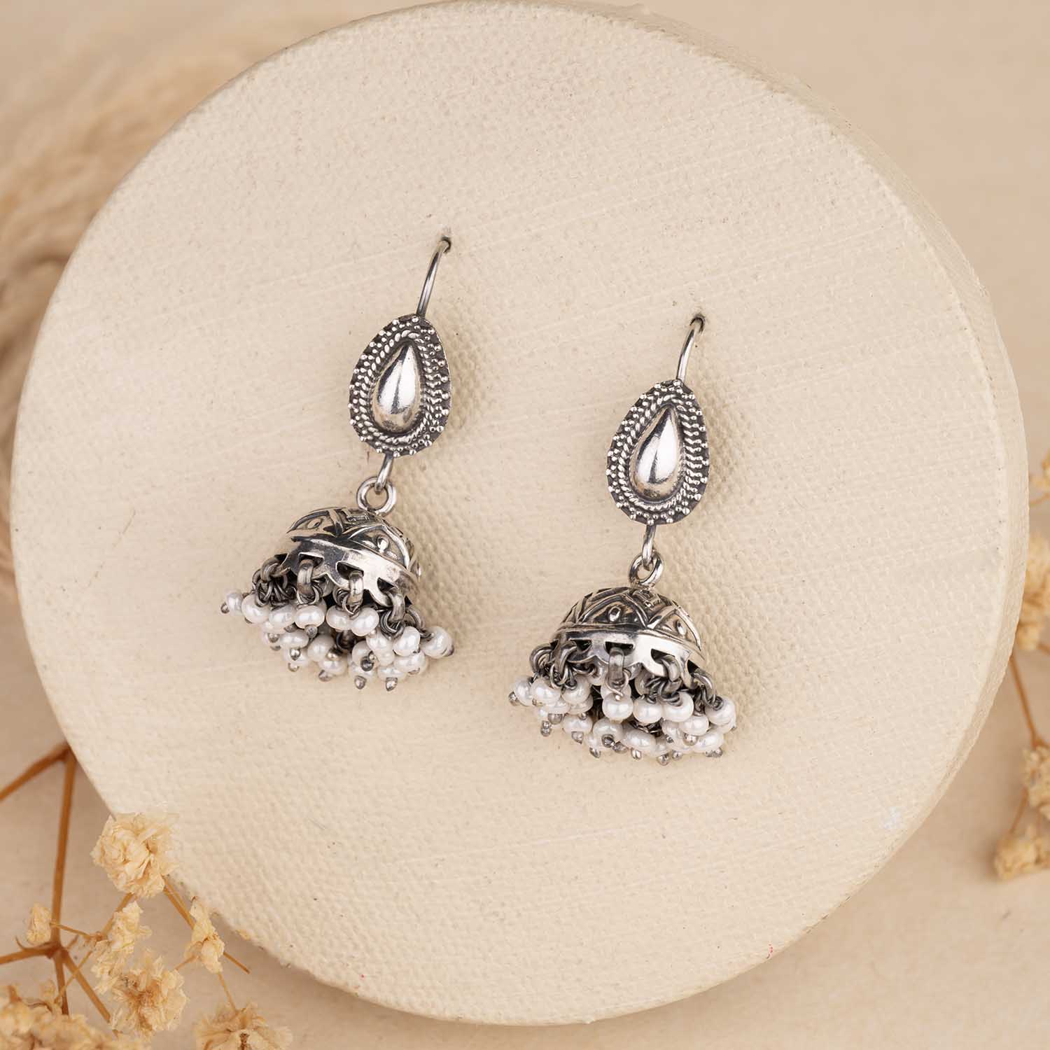 Handcrafted in sterling silver with an oxidised finish, these classic jhumkas feature intricate detailing and a vintage appeal. A must-have for ethnic and festive looks.