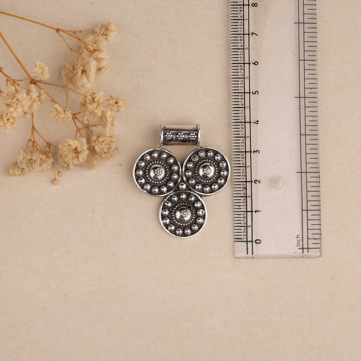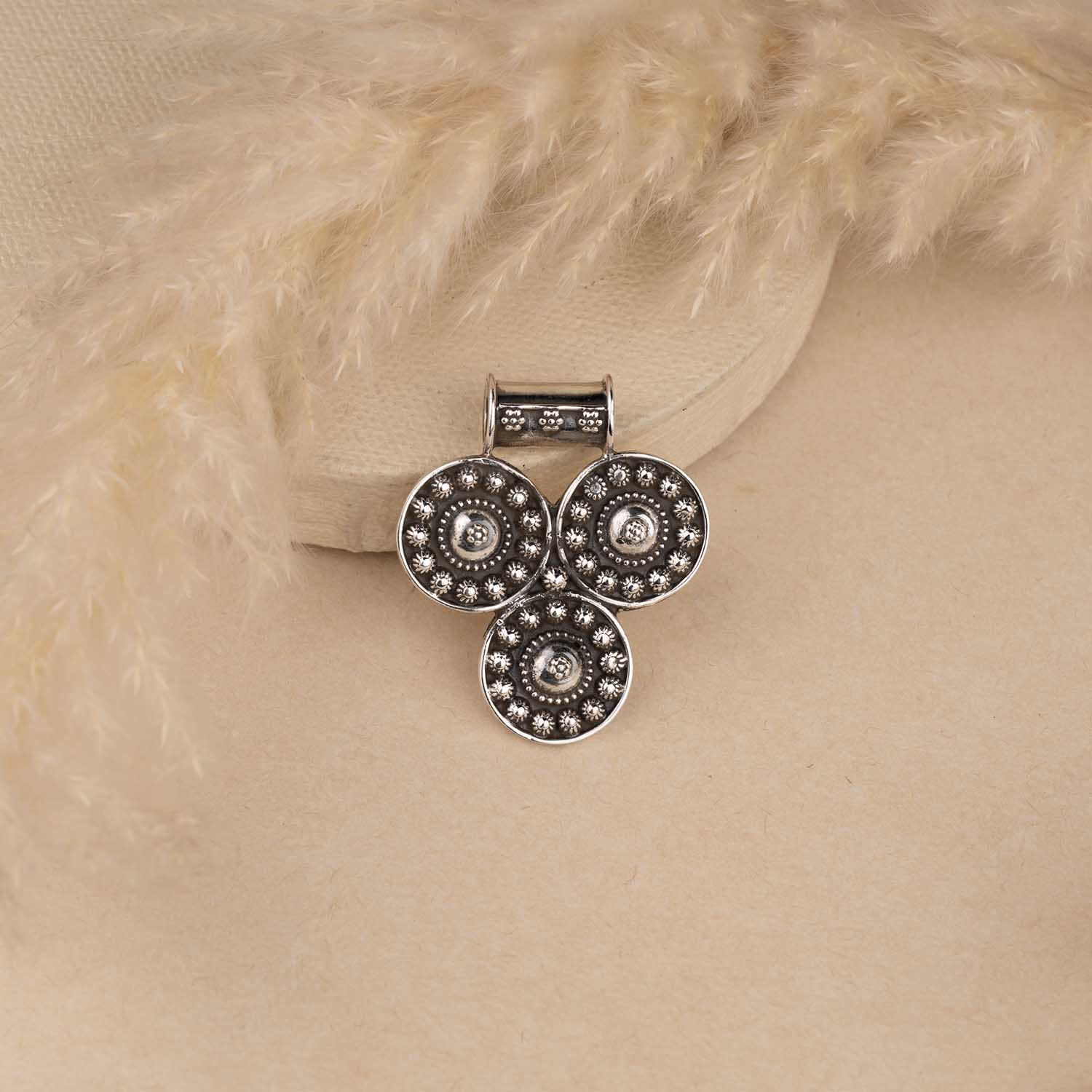 Make a bold impression with this oxidised tribal-inspired pendant. The rustic silver finish and handcrafted motifs reflect the essence of Indian craftsmanship — a perfect choice for those who love earthy, statement-making jewelry.