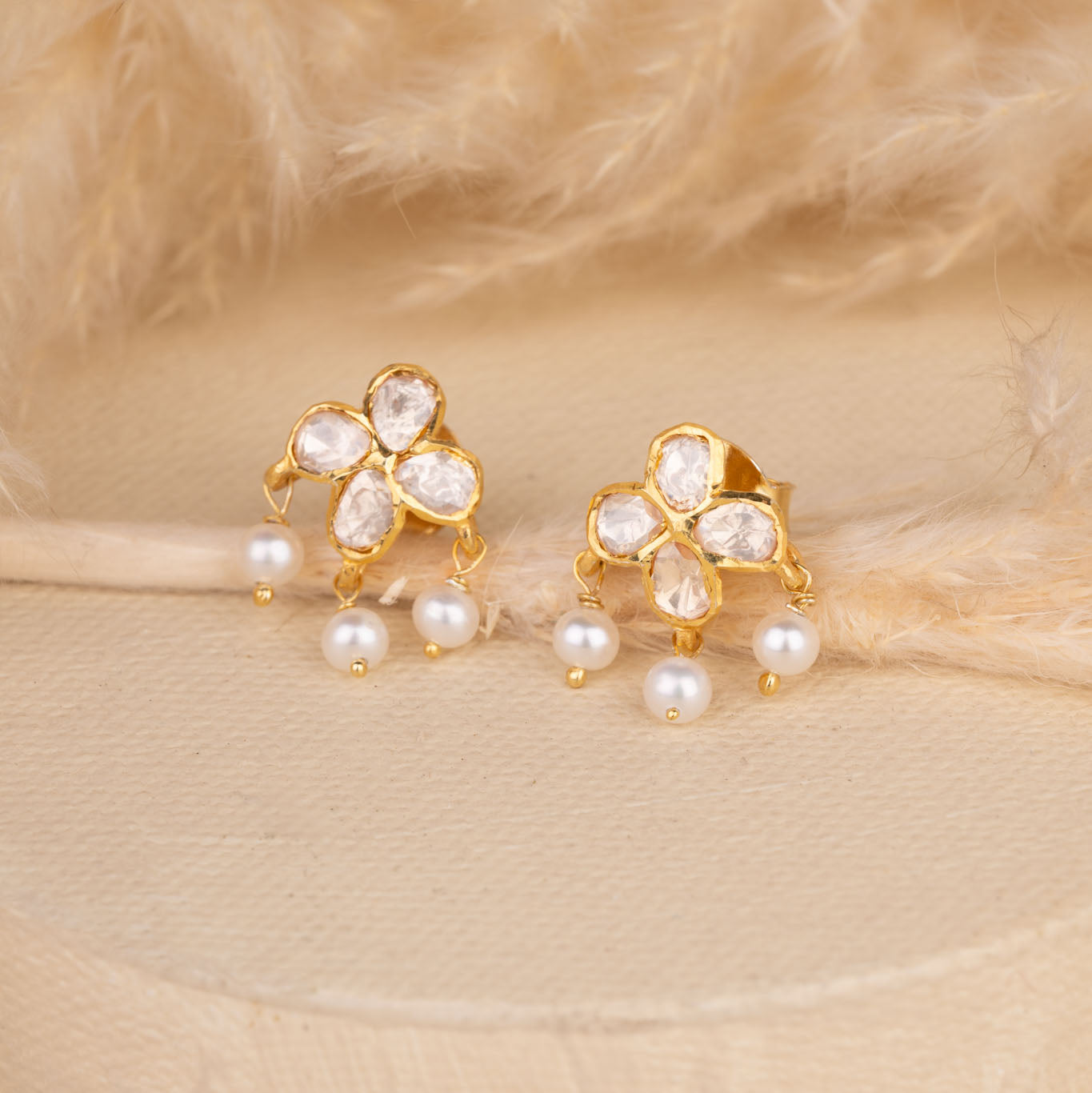 Classic yet contemporary, these handcrafted floral earrings feature radiant moissanite stones set in 925 sterling silver with a gold finish. Their Polki-inspired design makes them a versatile choice for festive and party wear.