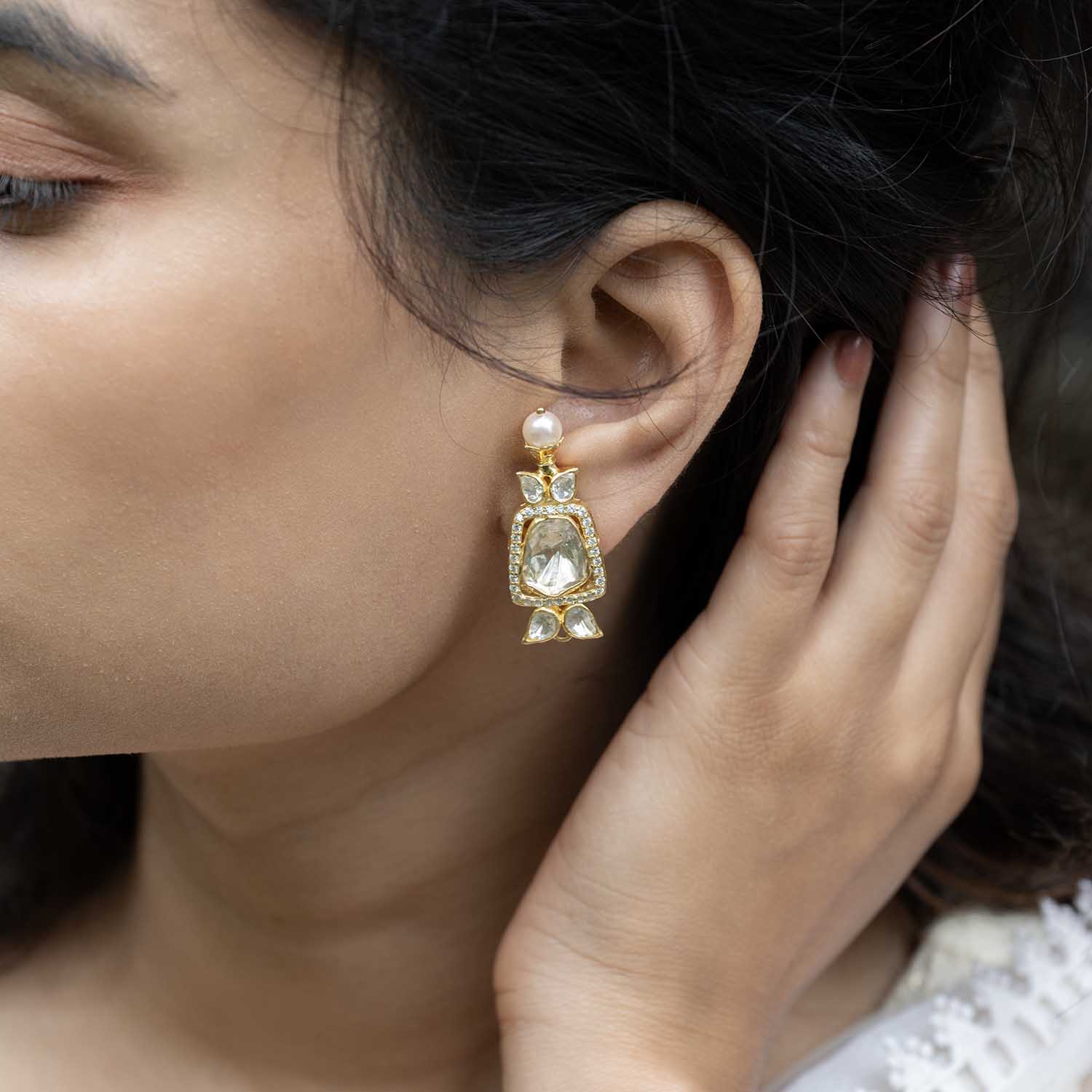 Grace your festive look with these elegant moissanite earrings in gold-finished silver. Designed with Polki-inspired craftsmanship, they add sophistication and sparkle to weddings, parties, and special occasions.