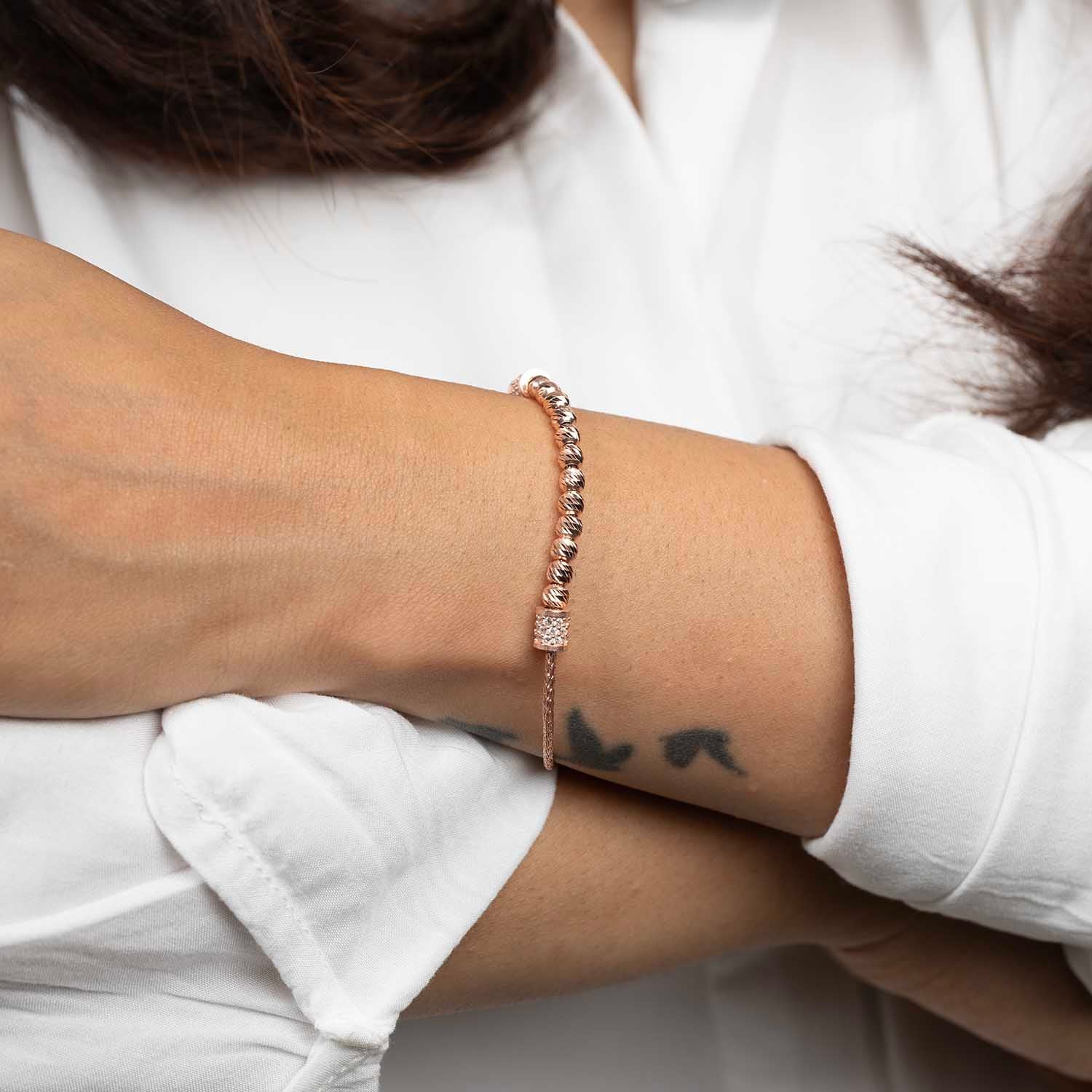 Add a soft, romantic glow to your look with this 925 silver bracelet in rose gold finish, beautifully studded with sparkling CZ stones. Perfect for both day and night wear.