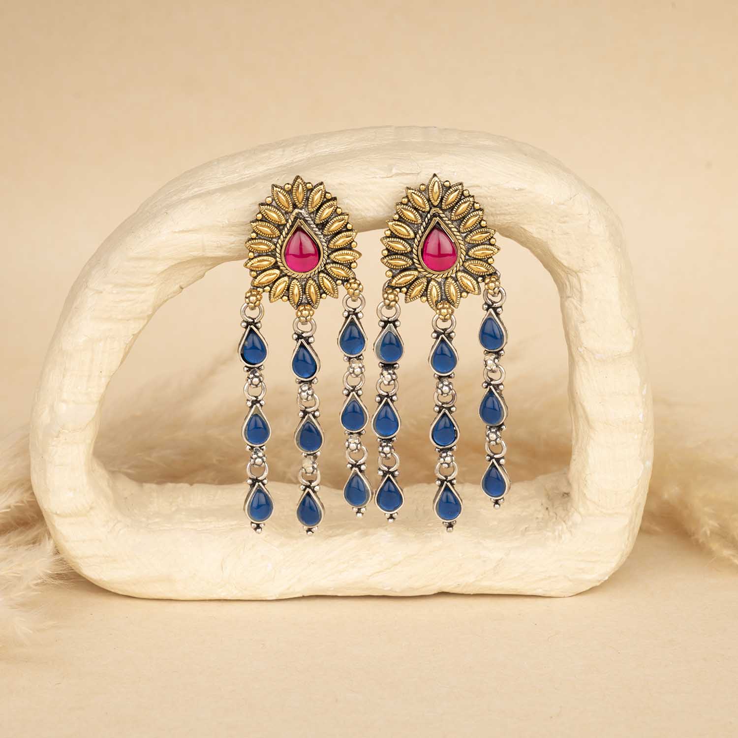 Inspired by traditional royal jewels, these antique-style earrings combine a gold-finish floral design with oxidised silver chains of blue droplets. Elegant and eye-catching, they are perfect for weddings, festivities, and grand soirées.