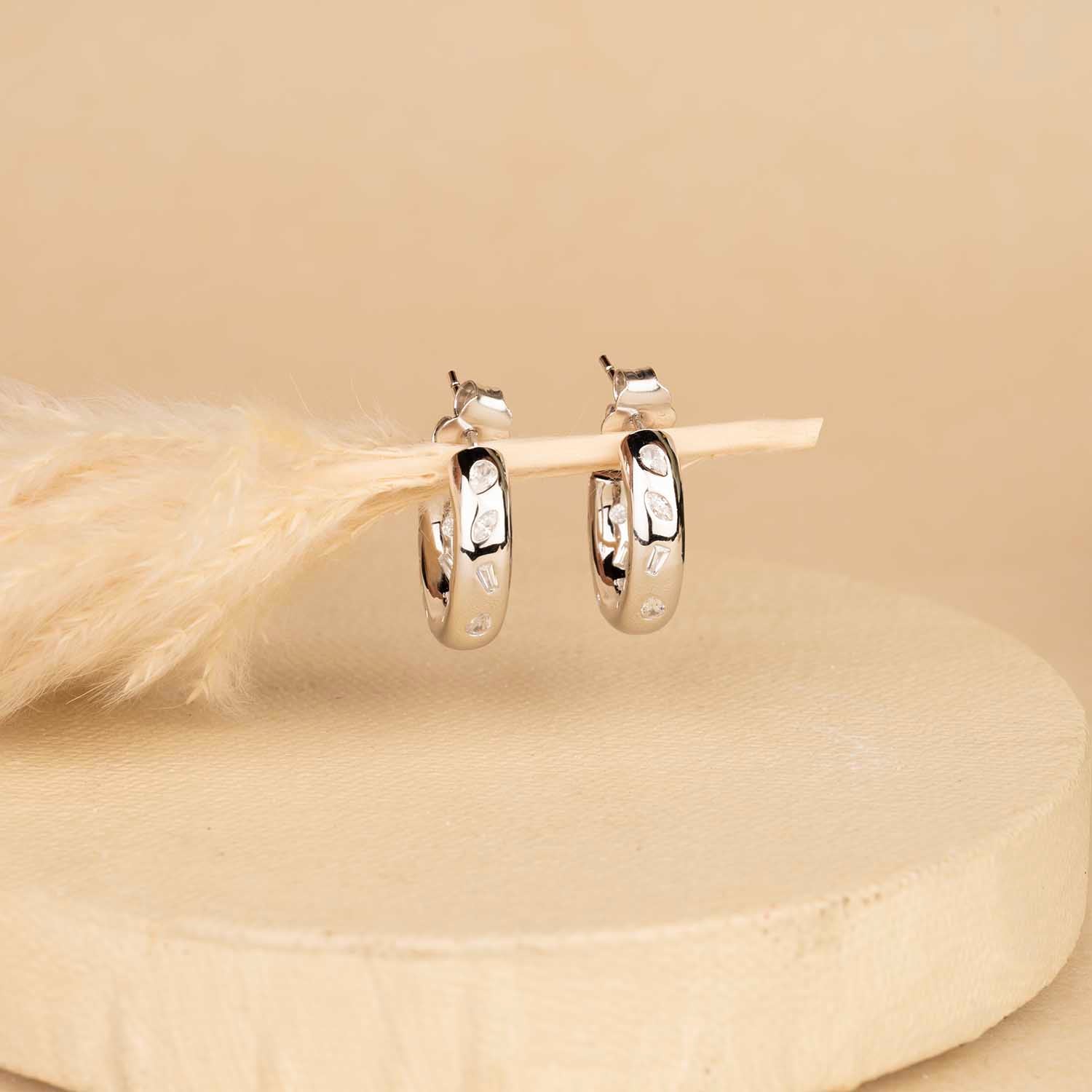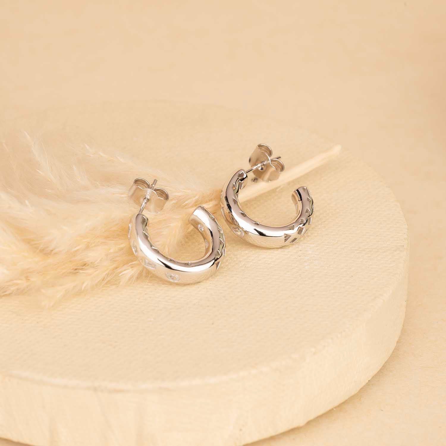 Designed in 925 sterling silver and finished with sleek rhodium plating, these hoops are encrusted with dazzling CZ stones for a luminous shine. The cool rhodium tone enhances their brilliance, giving them a modern and versatile appeal that complements every style.