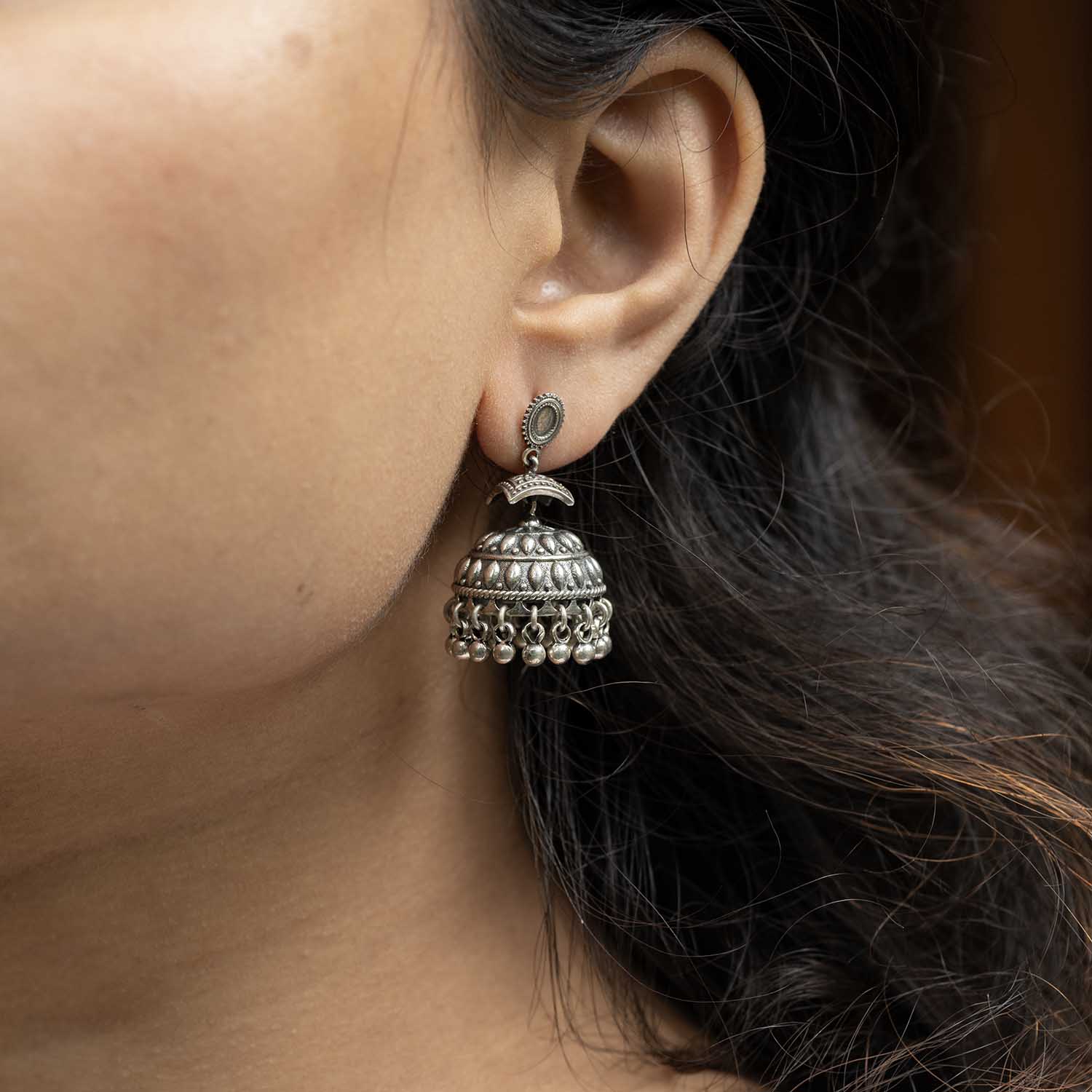 Handcrafted in sterling silver with an oxidised finish, these classic jhumkas feature intricate detailing and a vintage appeal. A must-have for ethnic and festive looks.