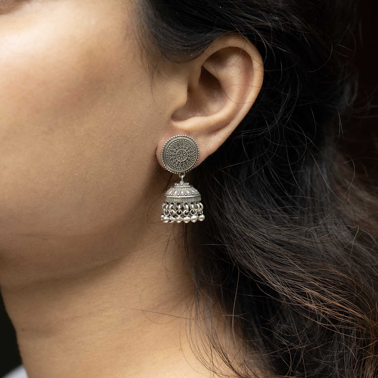 Handcrafted in sterling silver with an oxidised finish, these classic jhumkas feature intricate detailing and a vintage appeal. A must-have for ethnic and festive looks.