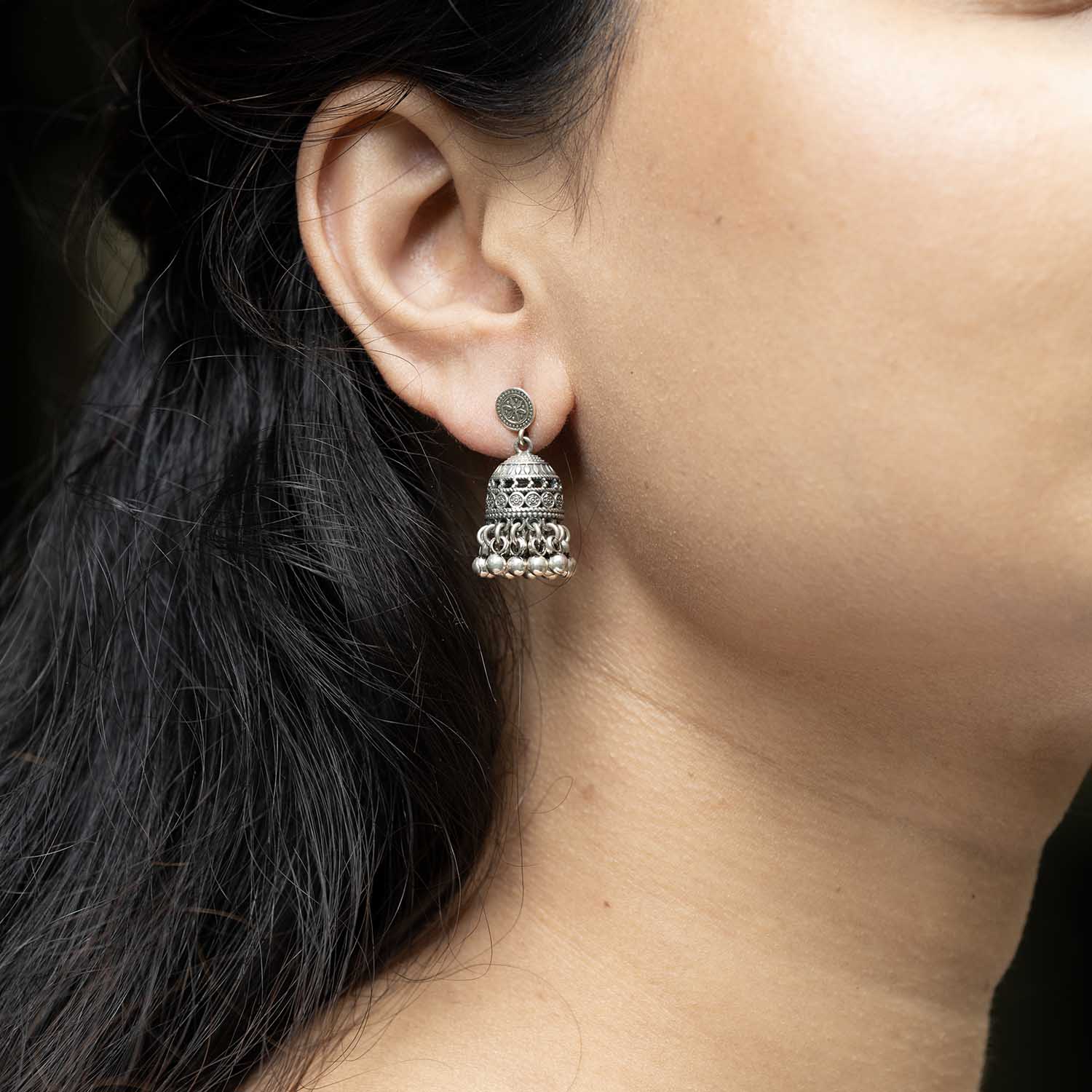 Handcrafted in sterling silver with an oxidised finish, these classic jhumkas feature intricate detailing and a vintage appeal. A must-have for ethnic and festive looks.