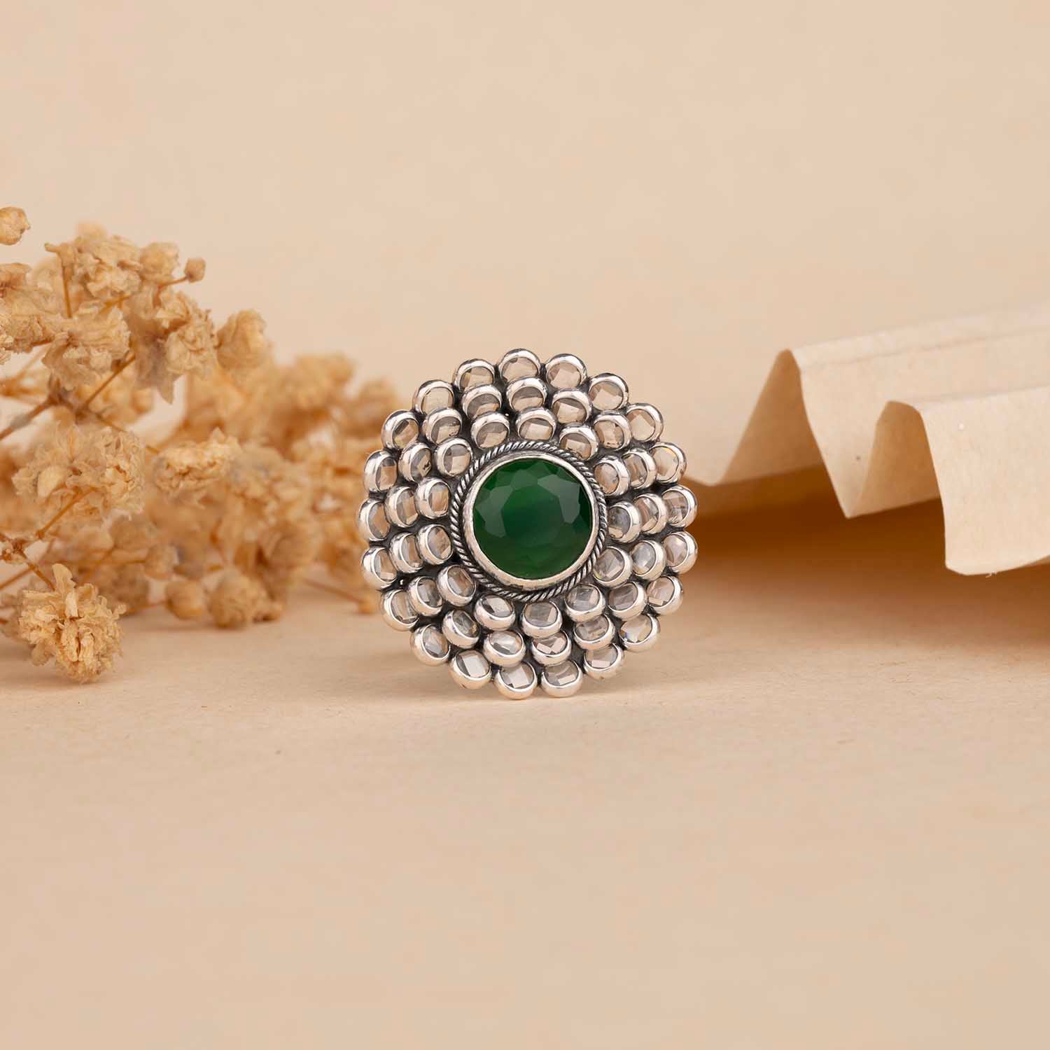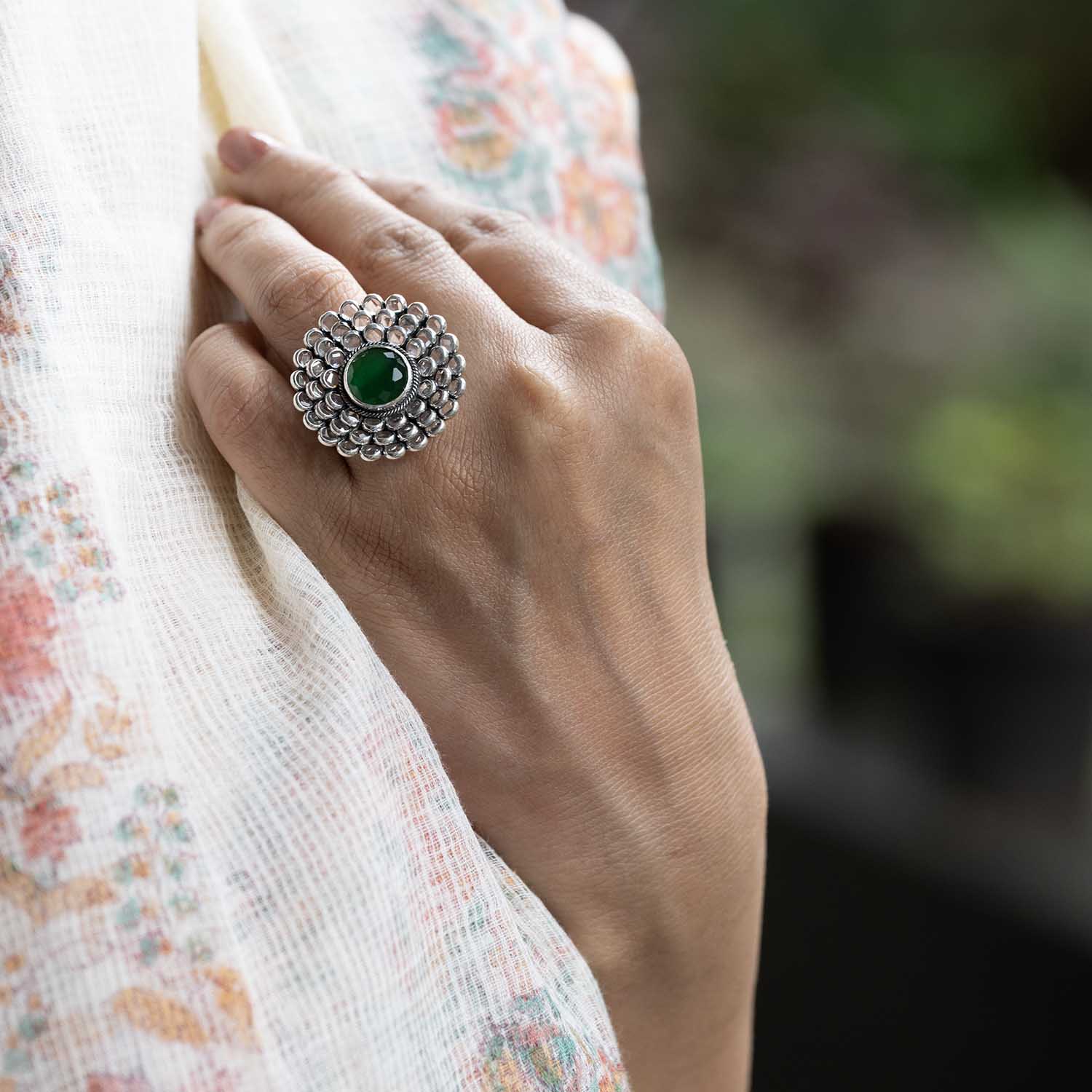 A timeless blend of tradition and modernity, this 925 sterling silver open ring is adorned with sparkling Polki-inspired detailing that adds a touch of royal charm. Its adjustable open design ensures comfort and style, making it a versatile choice for both festive occasions and everyday elegance.