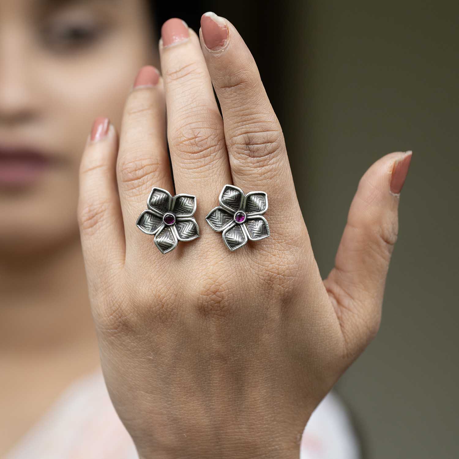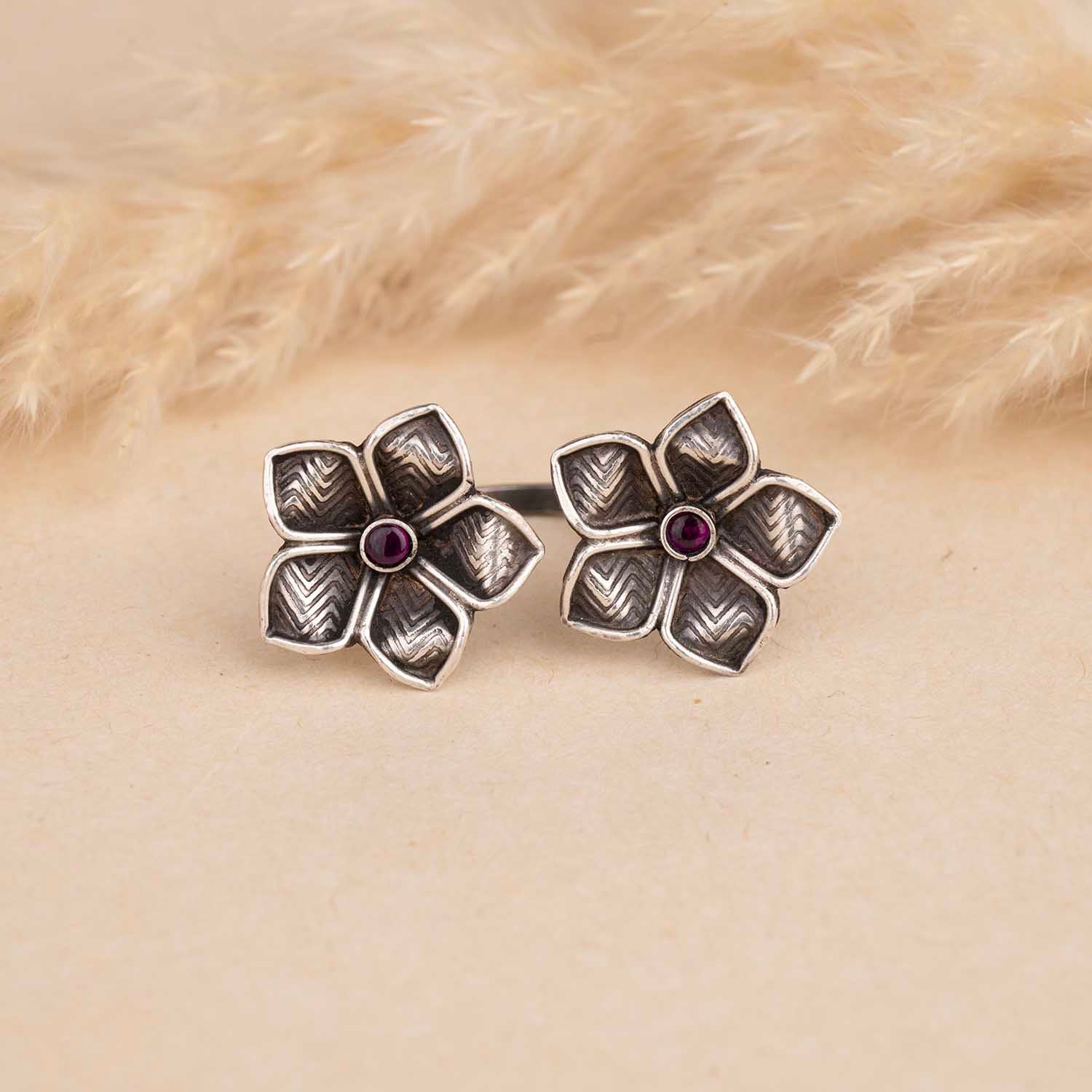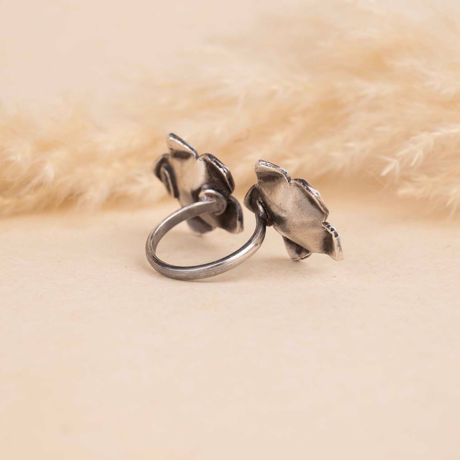 Beautifully handcrafted in 925 sterling silver with an oxidized finish, this ring showcases a dual-flower motif, symbolizing grace and femininity. The antique polish highlights the intricate petal patterns, giving it a rustic yet timeless charm.