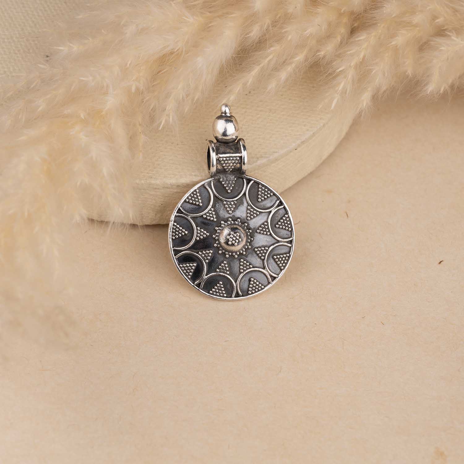 Embrace timeless beauty with this handcrafted oxidised silver floral pendant. Made in 925 sterling silver, its antique detailing and intricate patterns add an old-world charm to your everyday look. Perfect for pairing with both ethnic and fusion outfits.