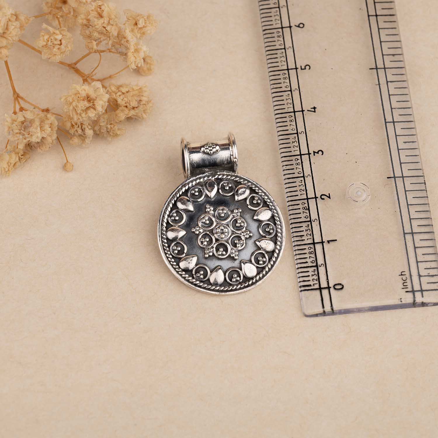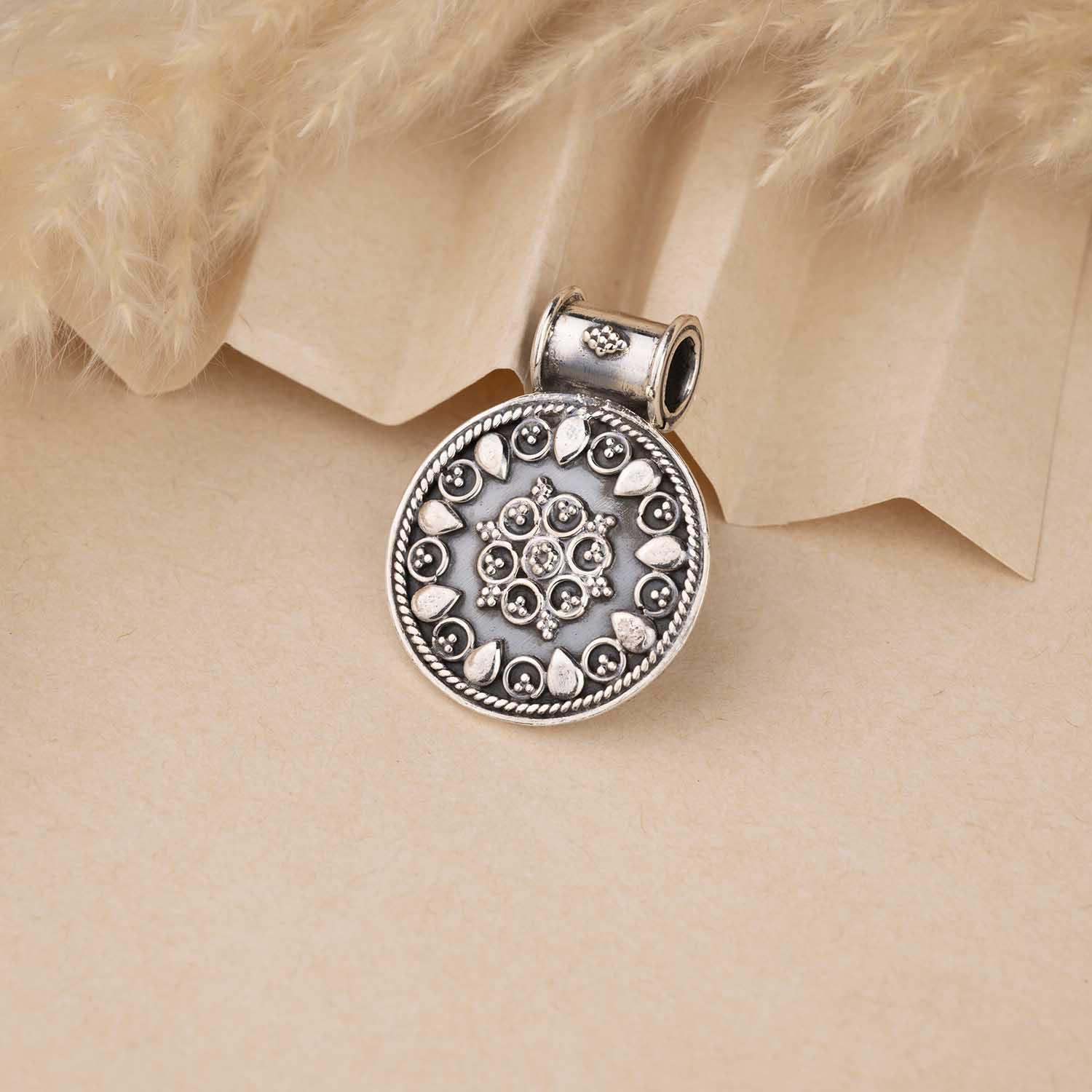 Embrace timeless beauty with this handcrafted oxidised silver floral pendant. Made in 925 sterling silver, its antique detailing and intricate patterns add an old-world charm to your everyday look. Perfect for pairing with both ethnic and fusion outfits.