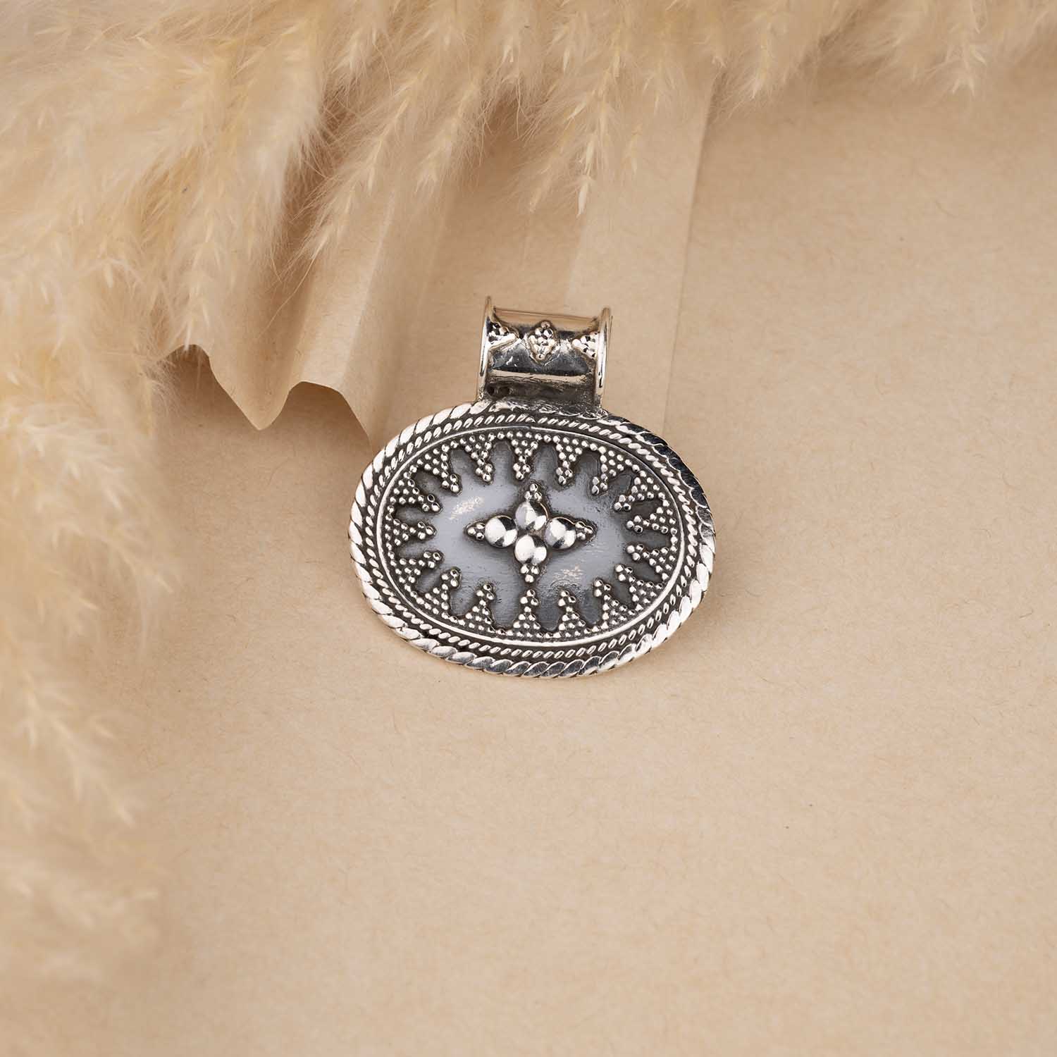 Make a bold impression with this oxidised tribal-inspired pendant. The rustic silver finish and handcrafted motifs reflect the essence of Indian craftsmanship — a perfect choice for those who love earthy, statement-making jewelry.