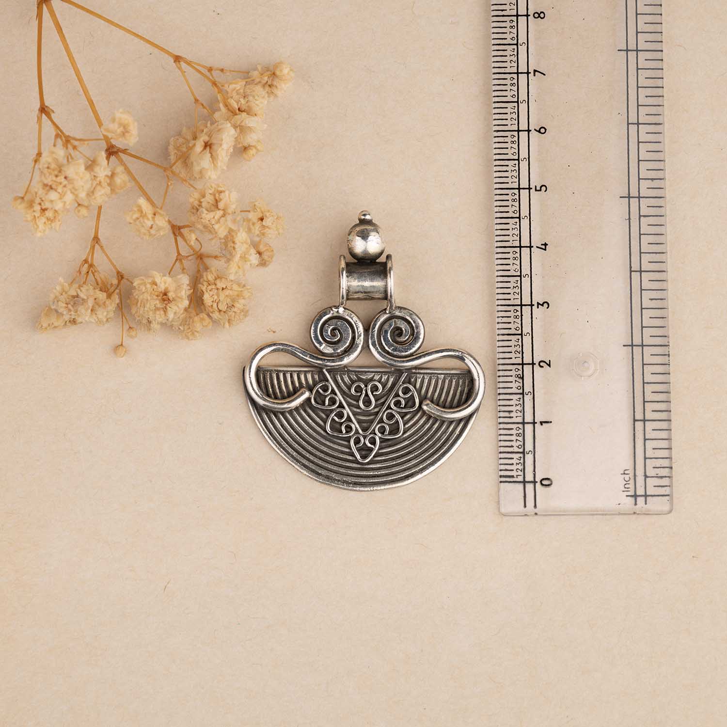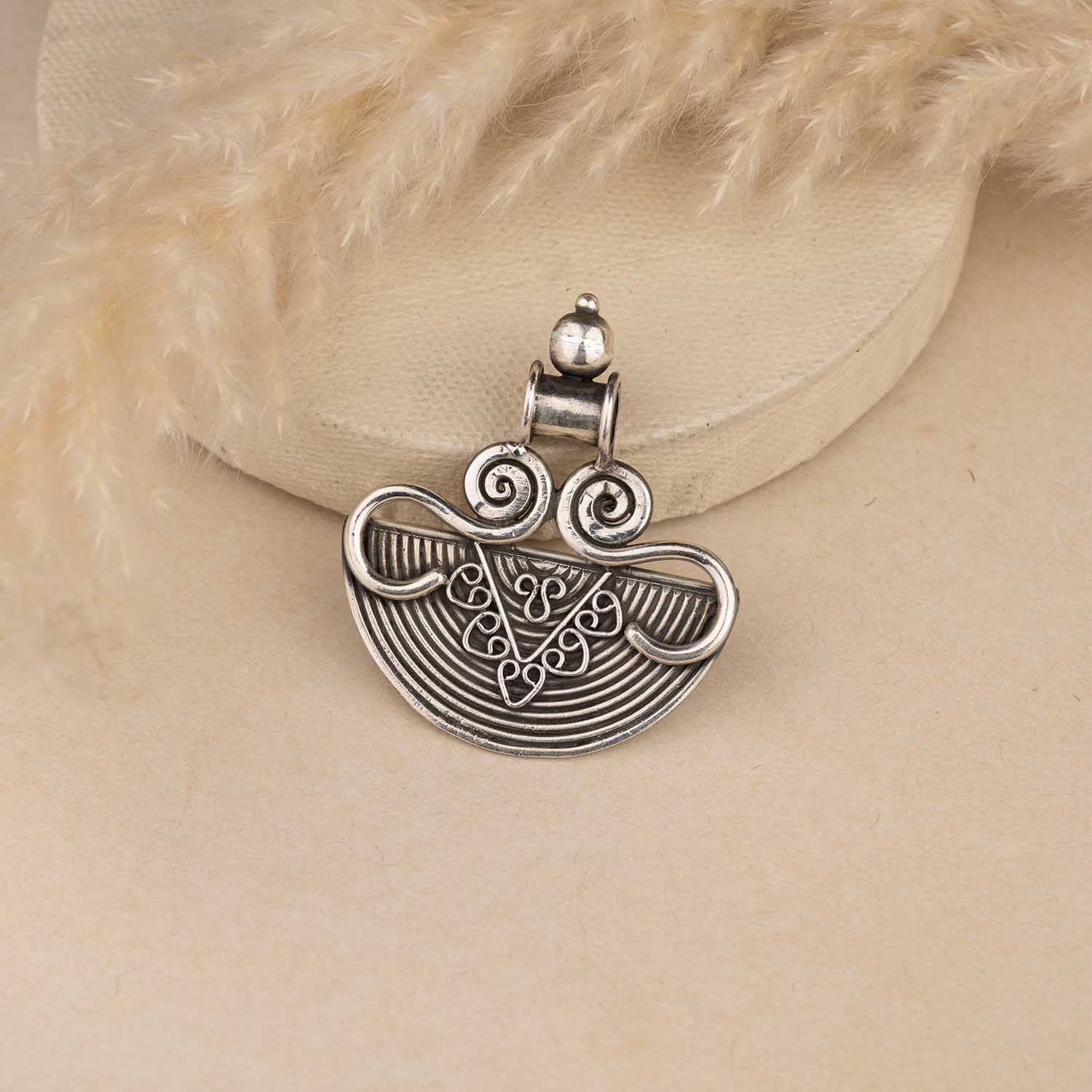 Make a bold impression with this oxidised tribal-inspired pendant. The rustic silver finish and handcrafted motifs reflect the essence of Indian craftsmanship — a perfect choice for those who love earthy, statement-making jewelry.