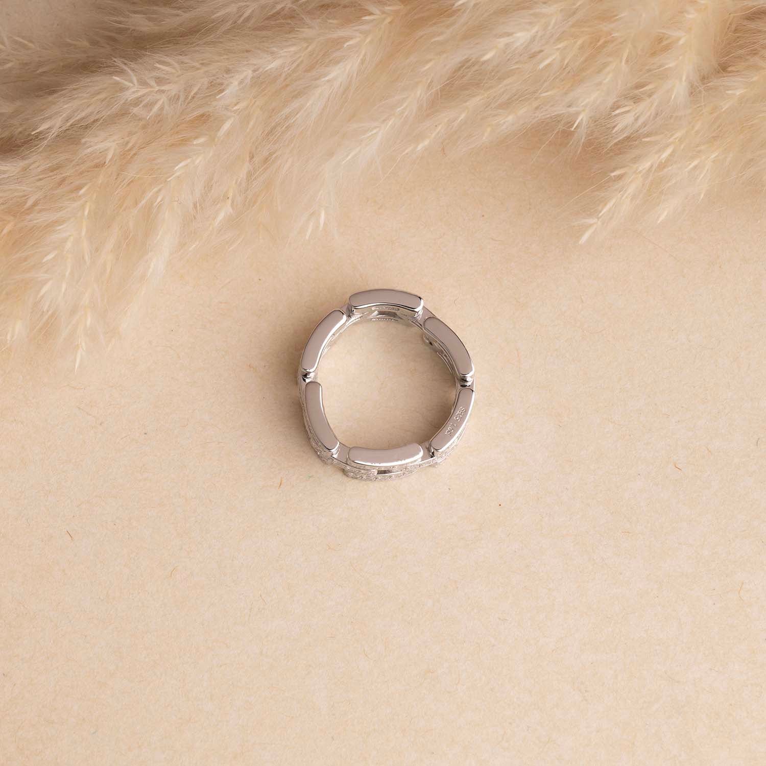 Designed in a link-style flexible setting, it offers both elegance and comfort, making it perfect for all-day wear. The brilliant cubic zirconia stones catch the light beautifully. Wear it solo for a chic, minimal look or stack it with other silver rings for a trendy layered style. Perfect for both everyday wear and special evenings.