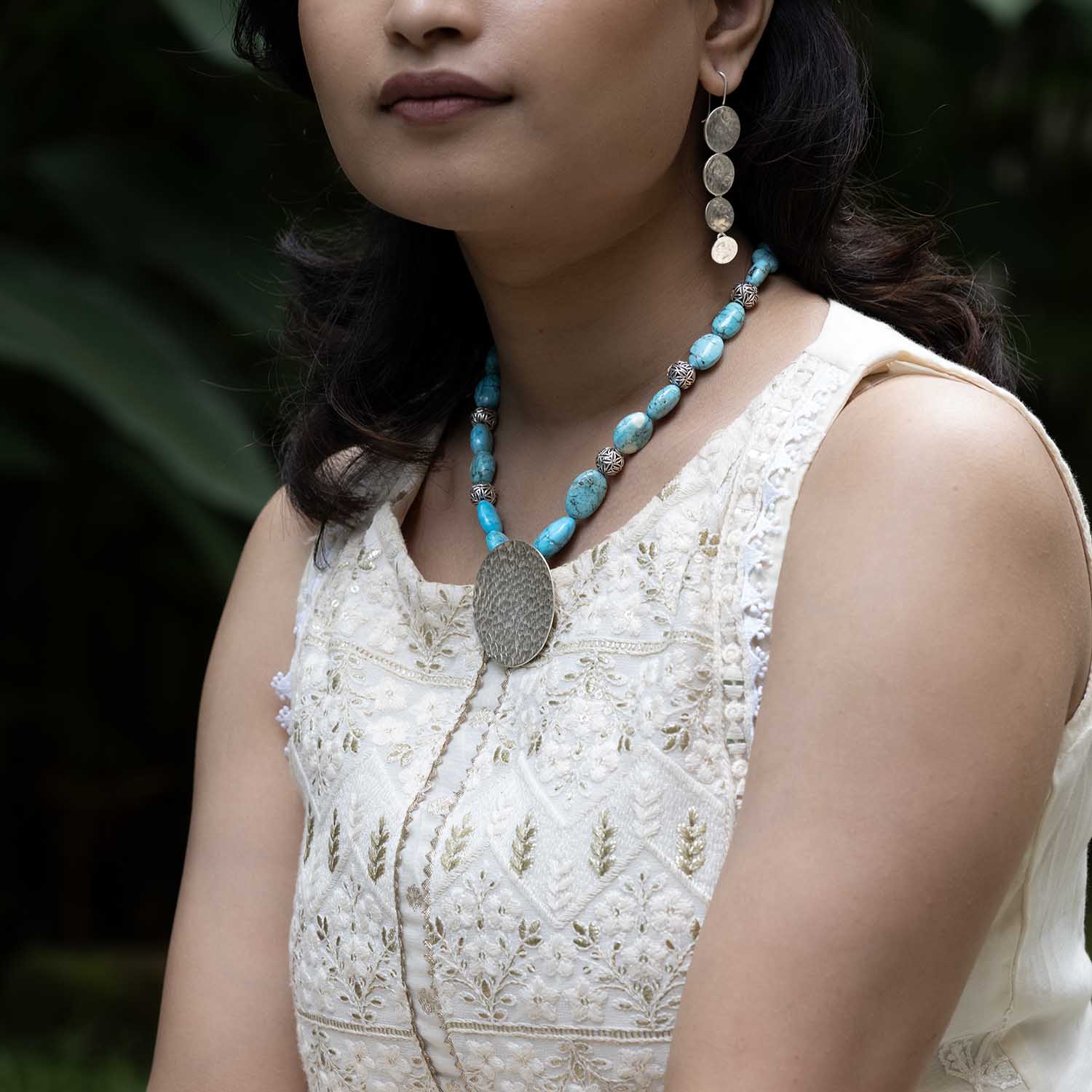 Make a bold yet graceful statement with this handcrafted turquoise beaded necklace, featuring a striking textured silver pendant. Each stone is paired with intricately designed silver beads, creating a perfect balance of color and shine. Ideal for adding a touch of artistic charm to festive or casual looks.